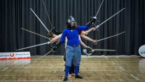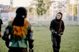 Im Oktober starteten wir mit demselben System in das Wintersemester, doch mit dem 3. Lockdown Anfang November mussten wir den Trainingsbetrieb erneut auf unbestimmte Zeit einstellen. Zeit zum Faulenzen blieb uns jedoch nicht viel, denn wenige Wochen später hatten unsere Rapier-Trainer*innen bereits ein Online-Training auf die Beine gestellt, um uns fit und bei Laune zu halten. Zwei Mal die Woche hatten wir die Möglichkeit von zu Hause aus mit Programmen wie „Sie nannten es die Woche des Schmerzes“ an unserer Fitness und Präzision an der Waffe zu arbeiten. Ausreden zählten nicht, denn wer keine eigene Waffe hatte oder platzmäßig auf ein Kämmerchen begrenzt war, musste als Trainingswaffe eben auf Bratpfanne, Nudelholz oder Schuhlöffel zurückgreifen.